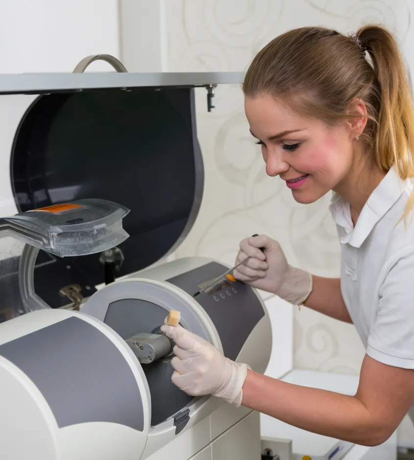 Our in-office milling machine carves your crown from a solid block of high-quality ceramic in about an hour. No waiting weeks for a dental lab—your crown is ready when you are.